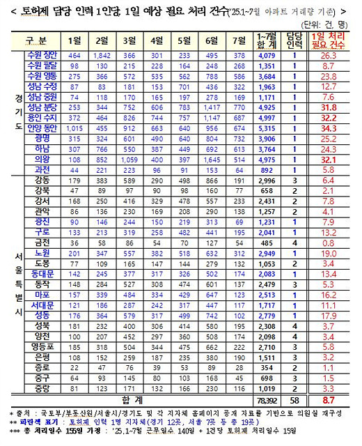 병행 업무 2개 이상인 상황에서, 하루에 처리해야 하는 예상 처리 건수는 평균 약 8.7건. 30건 넘는 지자체도 多(안양 동안 34.3건 등 4곳, '25.1~7월 아파트 거래 기준)