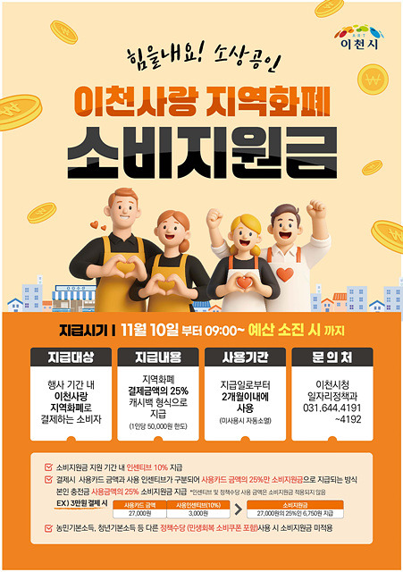 [이승철 기자]=이천시(시장 김경희)는 경기침체로 어려움을 겪는 소상공인을 돕고 지역 내 소비를 촉진하기 위해 11월 10일부터 11월 30일까지 ‘힘을 내요! 소상공인’ 이천사랑 지역화폐 소비지원금 행사를 본격 시행한다고 밝혔다.